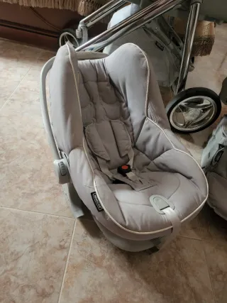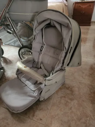 Preciosa silla de paseo de color beige, en muy buen estado. - Incluye capota. - Estructura ligera y fácil de plegar. - Ruedas resistentes y giratorias. Todo lleva su cubre pies que están nuevos sin estrenar. Regalo bolso . El carro costó 800€ El capazo duro un mes y medio y la sillita tiene también poco uso es muy ligero y tiene muy buena amortiguación.