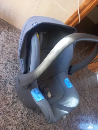Silla de coche Chicco en color gris y azul. - Capota incluida. - Asa de transporte. - Arnés de seguridad.