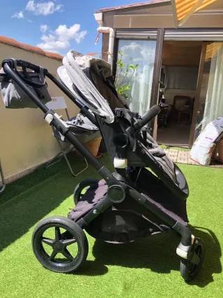Se vende carrito Bugaboo Fox 2 completo. - Incluye capazo con colchón. - Incluye silla. - Incluye 2 capotas: capota original del carro y la capota de verano ventilada con mosquitera (comprada a parte). - Manillas y barra en cuero marrón (color original), pero se han comprado nuevas unas fundas en color negro. - Ruedas desmontables (muy práctico para el maletero). En general está en buen estado, tiene rozaduras en el chasis del uso y del roce al plegarla.