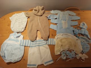 Lote ropa bebé de 0 a 6 meses temporada invierno-primavera. Incluye: -Mono abrigadito -4 conjuntos -2 chaquetas, 4 jerseys, 1 pelele, capotas y patucos (todo hecho a mano sin estrenar) -2 peleles sisa (primavera-verano) -pijamas -camisetas manga larga -pantalones y petos -bodys -muselina -mantita