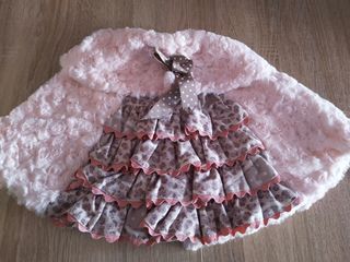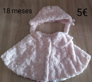 Se vende precioso conjunto de capa y capota en color rosa con detalle de volantes en la parte de atrás. La capota es talla 12 meses y la capa 18 meses por lo que se podría usar de 12-18 meses.
