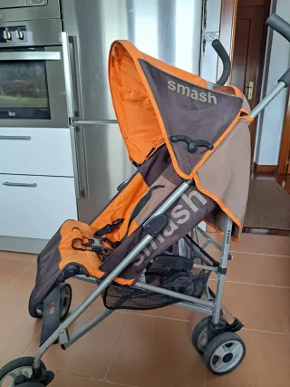 Silla de paseo ligera y práctica, con un diseño moderno en tonos naranja y marrón. - Capota con visera. - Arnés de seguridad. - Cesta de almacenamiento inferior. - Ruedas delanteras giratorias.