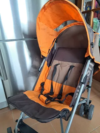Silla de paseo Chicco London en color rojo. Es ligera y fácil de plegar. - Capota. - Arnés de seguridad. - Barra delantera. - Ruedas delanteras giratorias, tiene alguna mancha de humedad en la capota como se puede ver en las fotos, el asunto siempre llevo funda por lo que está perfecto, las agarraderas impecables, arnés y enganches perfectos.