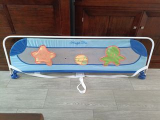 Barrera de cama para bebé, de la marca Magic Sea. - Diseño infantil con temática marina. - Incluye una red de malla para mayor seguridad. - Fácil instalación y ajuste. - Tiene un pequeño desperfecto en la malla como se ve en la foto