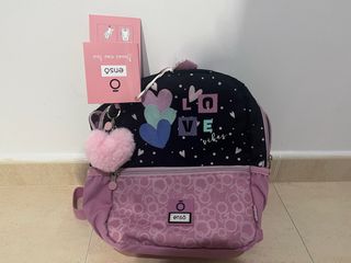 Mochila infantil de la marca Enso con un diseño divertido y colorido. sin estrenar - Estampado de corazones y Love vibes. - Llavero de pompón rosa. - Parte inferior en tono lila con estampado. - Cierre de cremallera.