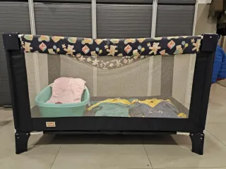 Minicuna de la marca Cambrass, ideal para los primeros meses del bebé. - Estructura de madera. - Textil con estampado de topitos. - Incluye colchón y almohada. - Ruedas para facilitar el desplazamiento. Si quiere se regalan juegos de sábanas para la minicuna