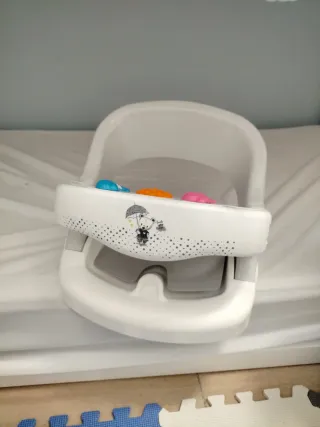 Silla de baño para bebés, diseñada para facilitar la hora del baño. Cuenta con un asiento cómodo y seguro. - Diseño giratorio. - Juguetes interactivos. - Colores: azul, naranja y rosa.