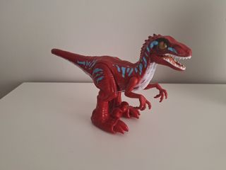 Figura de dinosaurio de color rojo con detalles en azul. Este juguete emite sonidos y tiene partes móviles. - Diseño inspirado en dinosaurios. - Ideal para coleccionistas o juego infantil.
