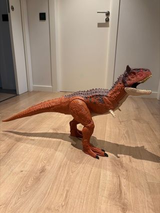 Figura de dinosaurio de gran tamaño, ideal para coleccionistas o para jugar. - Color naranja con detalles oscuros. - Textura rugosa. - Patas y cola detalladas.
