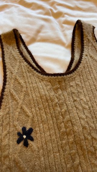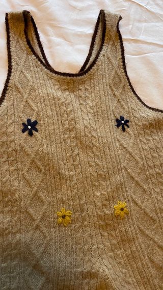 Mono de punto con un diseño encantador de flores bordadas. - Tejido de punto con trenzas. - Flores bordadas en azul y amarillo. - Ribete marrón en cuello y sisas.