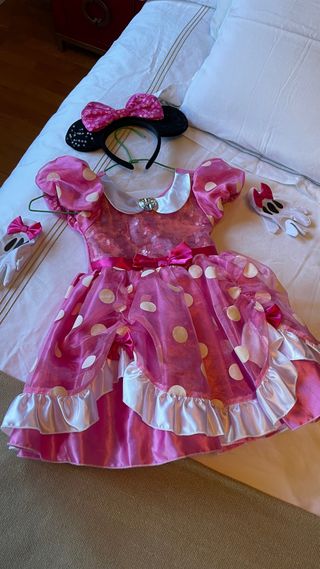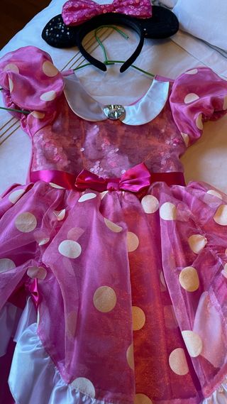 Disfraz de Minnie Mouse en color rosa con lunares blancos. Incluye diadema con orejas y lazo, vestido y guantes. - Vestido con lentejuelas y volantes. - Lazo en la cintura. - Guantes blancos con detalles. - Diadema con orejas y lazo.