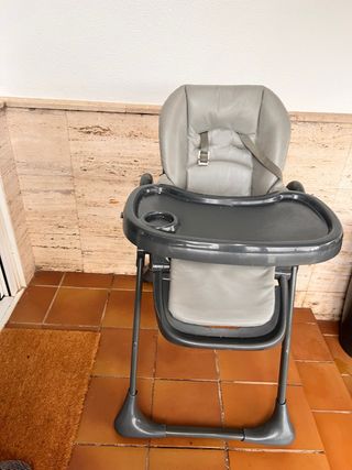 Trona Kinderkraft en color gris, ideal para las comidas de los más pequeños. Es plegable para facilitar su almacenamiento. - Asiento acolchado. - Bandeja extraíble. - Arnés de seguridad.