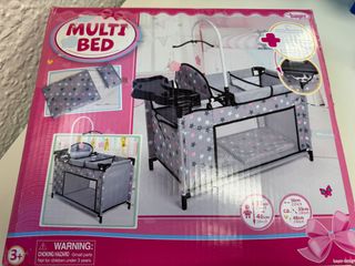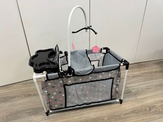 Cuna de viaje para muñecas con estampado de estrellas grises y rosas. Incluye cambiador y móvil. - Estampado de estrellas grises y rosas. - Incluye cambiador. - Incluye móvil. - Medidas aproximadas: 56x33x48 cm. Caja dañada , le falta 1 percha