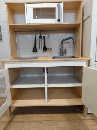 Cocina de juguete de madera y blanco, de Ikea. - con microondas, fogones, fregadero y grifo. - Puertas y cajones para guardar. En buen estado.