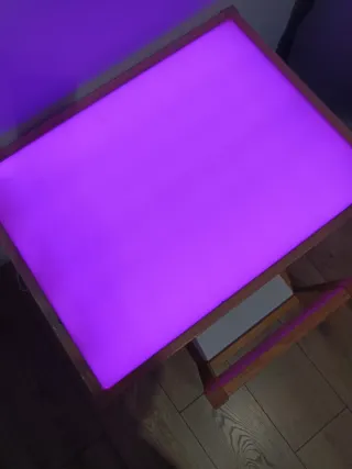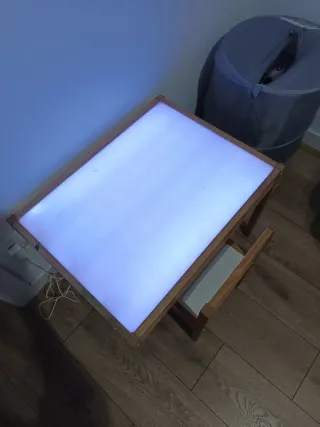 Mesa de luz hecha con mesa infantil de Ikea. Con superficie de metacrilato, apta para uso infantil. Diferentes colores e intensidades de luz que se regulan con mando a distancia. Con signos de uso (pintura) de haberla utilizado antes como mesa normal.
