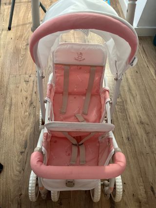 Carrito gemelar de juguete con un bonito diseño en color rosa y blanco. Ideal para que los más pequeños jueguen a pasear sus muñecos. Nuevo vale 80 euros - Capota ajustable. - Arnés de seguridad. - Barra frontal acolchada.