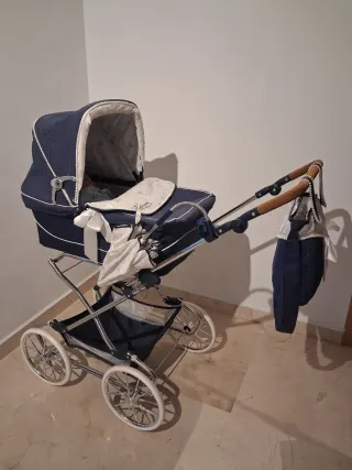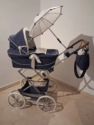 Elegante carro de muñecas de estilo clásico, perfecto para coleccionistas o para jugar. - Diseño acolchado en color azul marino. - Detalles en blanco y lazo. - Incluye sombrilla a juego. - Cesta inferior de rejilla. - Ruedas grandes con llantas cromadas.