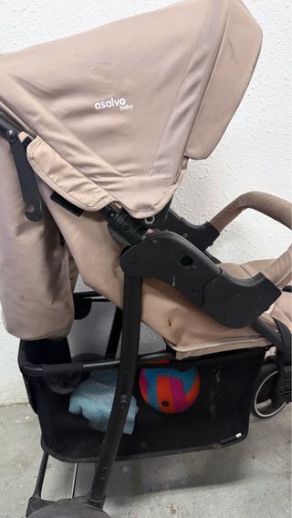 Carrito de bebé de la marca Asalvo en color beige. Ideal para paseos cómodos. - Capota extensible. - Cesta de almacenamiento inferior. - Asiento reclinable.