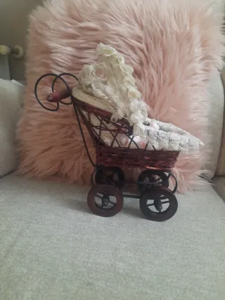 Pequeño carrito de muñecas, ideal para Barriguitas o Jesmarin. - Diseño vintage. - Ruedas de madera. - Capota de encaje blanco.