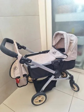 Carrito de juguete tipo Bugaboo, ideal para muñecos. - Color beige y negro. - Incluye bolso. - Estructura metálica y ruedas. - Plegable.