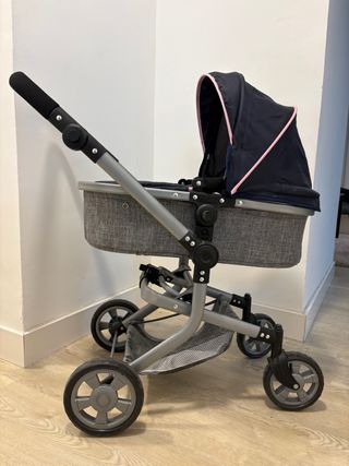 Bonito carrito de muñecas con un diseño alegre y llamativo. - Tejido azul marino con estampado de triángulos rosas. - Detalles y ribetes en color rosa fucsia. - Incluye capazo y bolso a juego. - Adornado con un lazo rosa en la capota.