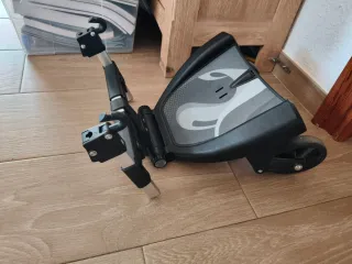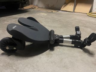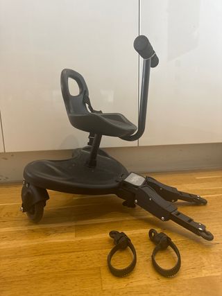 Accesorio para carrito de bebé, se acopla a la parte trasera. - Plataforma negra. - Asiento negro. - Ruedas. - Incluye dos correas de sujeción. Esta en muy bien estado Solo le falta un parte de cinturon que mi nina no lo quieria quando estaba pequeña y no lo utilizaba nunca y me a perdido. Pero el nino tiene la parte trasera y esta seguro .