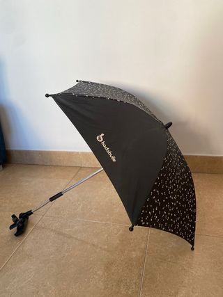Parasol azul para carrito de bebé. - Incluye soporte con pinza. - Varilla flexible y ajustable.