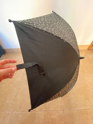 Sombrilla negra con estampado de puntos blancos, ideal para proteger del sol. Diametro 75cm.en perfecto estado se uso una vez solo. A recoger Son Oliva!