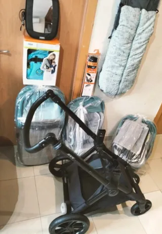 Carrito de bebé Playxtrem de 3 piezas, ideal para paseos cómodos. - Diseño moderno y funcional. - Incluye capazo, silla de paseo y silla de coche. - Estructura resistente y ligera. - Regalo funda para lluvia Muy poco uso!!