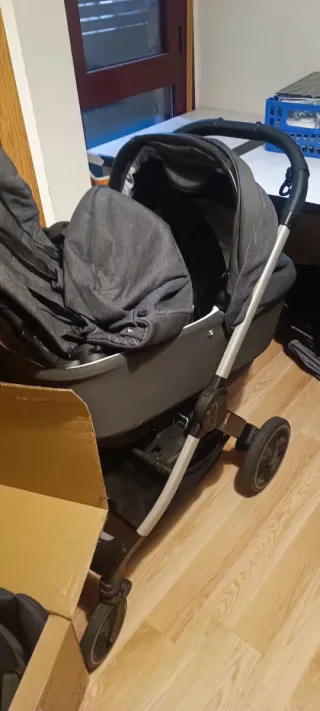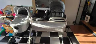 - Capazo, silla de paseo y silla de coche. - Color gris oscuro. - Incluye plástico de lluvia sin usar y todas las instrucciones. - Las capotas tienen protección UV50+ y son resistentes al agua. - El manillar tiene varias alturas. - La silla de paseo se puede poner en las dos direcciones (mirado para los papás o para afuera). - El respaldo de la silla de paseo se reclina totalmente y el reposapiernas es ajustable. - El chasis se puede cerrar con una sola mano y se puede cerrar con o sin la silla de paseo. - Las 4 ruedas se pueden quitar fácilmente. Está prácticamente nuevo, lo único que tiene mal es el manillar que se está pelando.