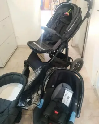 Carrito de bebé Playxtrem de 3 piezas, ideal para paseos cómodos. - Diseño moderno y funcional. - Incluye capazo, silla de paseo y silla de coche. - Estructura resistente y ligera. - Regalo funda para lluvia Muy poco uso!!