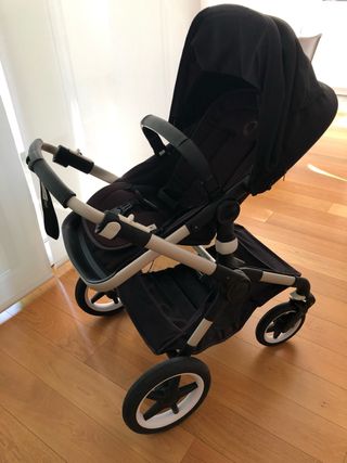 Se vende carrito Bugaboo Fox 2 completo con capazo y patinete. - Chasis color negro. - Capazo con capota gris. - Incluye patinete. - Ruedas todoterreno.