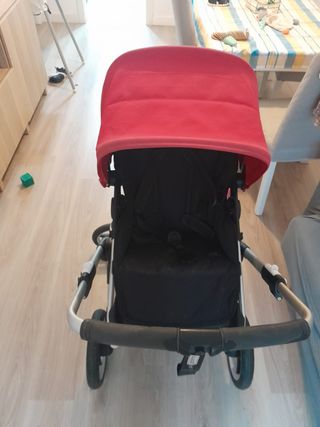 Carrito de bebé Bugaboo Fox 1 en color negro y capota roja. - Chasis negro. - Capota extensible en color rojo. - Asiento acolchado. - Ruedas todoterreno. La estructura está perfecta.