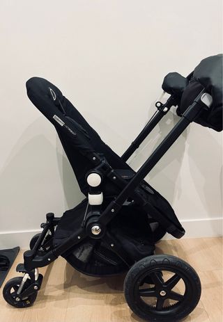 Se vende carrito de bebé Bugaboo Camaleon 3 en color negro, junto con varios accesorios. - Chasis negro. - Capazo nuevo - Silla de paseo. - 2 Burbuja de lluvia ( La original y la de Alta Calidad) - Adaptadores de Silla de Auto Maxi-Cosi Bugaboo. - Patinete acoplado Bugaboo Confort+ con adaptadores NUEVO Casi todo en sus cajas originales. En muy buen estado. El capazo esta nuevo nuevo! La silla utilizada dos años. Los signos de desgaste son algun rallon en el chasis que se ve en la foto y desgaste del cuero del manillar. El resto esta como nuevo. El chasis tiene un año, ya que me lo cambiaron. Opcion de vender cosas por separado