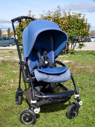 Carrito de bebé Bugaboo Bee en color azul. Perfecto para paseos cómodos. - Ligero y fácil de plegar - Incluye el capazo y la silla - La silla tiene una colchoneta original de Bugaboo, a juego con la capota - Cesta de compras. - Ruedas todoterreno. - Los agarres de cuero son nuevos - Regalamos la funda de plástico anti-lluvia y el saco de abrigo