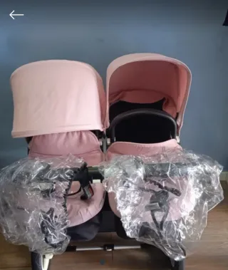 Carrito gemelar Bugaboo en color beige y rosa. Perfecto para hermanos con poca diferencia de edad. - Chasis robusto. - Capotas ajustables. - Ruedas todoterreno. -Plástico lluvia incluido -cesta lateral compra incluida