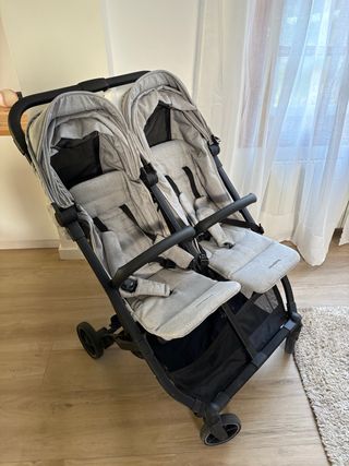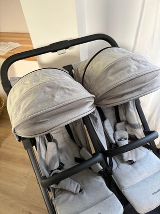 Carrito doble Casualplay en color gris, ideal para hermanos o gemelos. Diseñado para ofrecer comodidad y practicidad. Incluye dos sillas y un capazo. Incluye plástico de lluvia sin estrenar y sujeta brazos - Asientos acolchados. - Capotas ajustables. - Cesta de almacenamiento