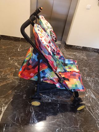 Carrito gemelar de la marca Cosatto con muy poco uso y con pequeño desperfecto en una de las sillas,del roce de la articulación de la sillita. - Diseño colorido y llamativo. - Estructura ligera y fácil de plegar.