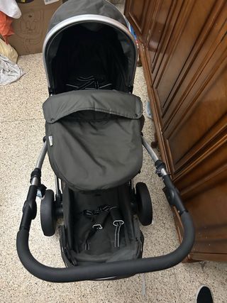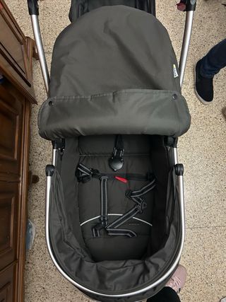 Carrito gemelar en color negro, ideal para hermanos con poca diferencia de edad. - Diseño moderno, ligero y funcional. - Capotas independientes. - Arnés de seguridad de 5 puntos. - Un capazo + 2 sillitas - Cesta con bastante soporte para accesorios, bolso, etc - Capa protectora para la lluvia - Fácil de plegar y para abrir con una mano Solo se ha usado 2 veces. Precio 485€ nuevo en tienda. Factura + garantía de tienda incluidas.