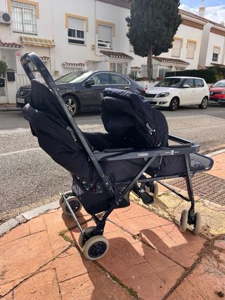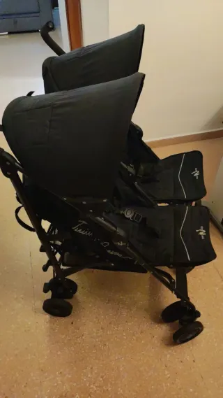 Silla gemelar compacta y ligera gracias a su chasis de aluminio. Con capota extensible y respaldo multiposiciones que funcionan de manera independiente para adaptarse a cada peque. Praticamente nuevo utilizado 3/4 veces