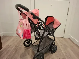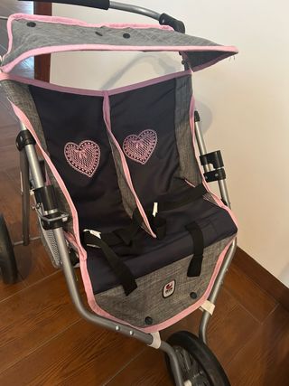 Carrito gemelar para muñecos Baby Born. Ideal para llevar a dos muñecos a la vez. Diseño en color rosa con detalles plateados. - Dos asientos con cinturones de seguridad. - Capota ajustable. - Ruedas resistentes para un fácil manejo. Movimiento de los asientos así como plegado del carrito funcionando perfectamente.