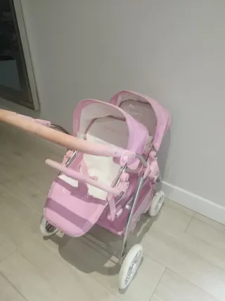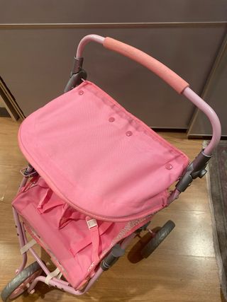 Carrito de juguete de color rosa, diseñado para llevar dos muñecos. Es plegable Está sin estrenar