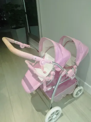 Carrito gemelar de juguete con un bonito diseño en color rosa y blanco. Ideal para que los más pequeños jueguen a pasear sus muñecos. Nuevo vale 80 euros - Capota ajustable. - Arnés de seguridad. - Barra frontal acolchada.