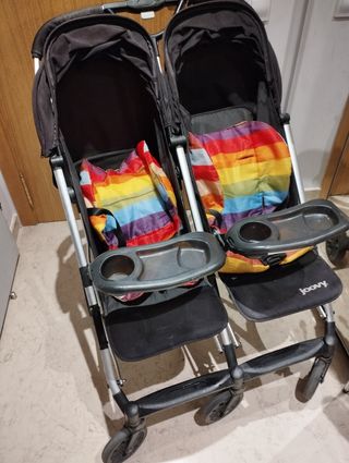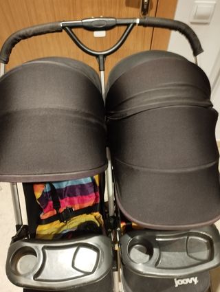 Vendo carrito gemelar Joovy en buen estado. Es ligero y fácil de plegar. - Dos asientos con capota. - Dos bandejas portavasos. Regalo dos cojines+ protector de lluvia.