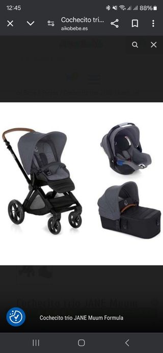 Carrito trio Jane Mumm de 2019 en gris, se incluye la silla de coche grupo 0+( hasta los 83 cm), capazo y silla de paseo. No se incluye bolsa.
