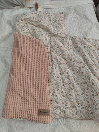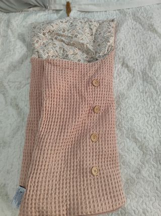 Saco para carrito de bebé en color rosa, con un diseño de gofre. Se puede utilizar tanto en capazo para recién nacido como en silleta, se adapta muy bien. - Tejido exterior de gofre. - Forro interior con estampado floral. - Cierre con botones de madera y gomitas para adaptar, también tiene cremallera