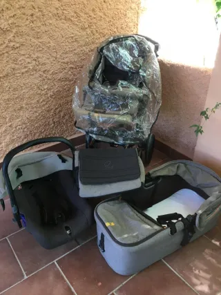 Bonito,cómodo y manejero carro gris para bebé marca Concord,modelo Wanderer,3en 1(capazo,maxi-cosis y silla de paseo).Capazo y maxi-cosis en perfecto estado,la sillita en muy buen estado y muy amplia,varias posiciones de reposapiés,barrita anticaida,cubre-pies impermeable y capota con apertura para ventilación.Tiene ruedas grandes y una excelente amortiguación,adaptándose perfectamente a terrenos abruptos.La capa negra esmaltada del chasis está levantada por alguna zona pero se puede pintar fácilmente.De capazo y maxi-cosis no puse foto ya que los tenía bien embalados y guardados,pero se puede enseñar sin problema. Precio original: 600€