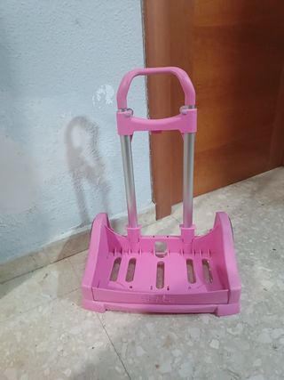 Carrito porta-mochila en buen estado. Ideal para transportar mochilas pesadas con comodidad. - Color rosa. - Asa de agarre cómoda y resistente. - Base de plástico resistente.