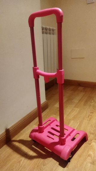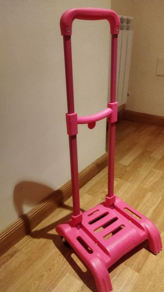 Carrito porta-mochila en color rosa, ideal para el colegio. Está en buen estado. - Perfecto para transportar la mochila con comodidad. - Estructura resistente y ligera. - Diseño sencillo y práctico. - Color rosa.