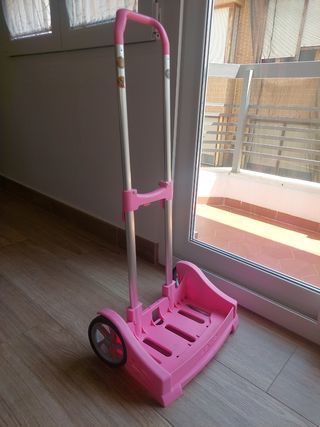Preciosa carretilla porta-mochila de color rosa, en perfecto estado. Apenas se ha usado. - Asa de transporte cómoda y resistente. - Estructura ligera y fácil de manejar. - Ruedas para facilitar el desplazamiento.